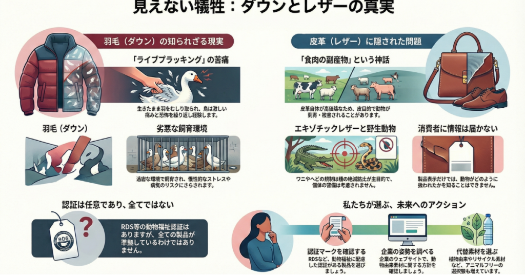 私たちが日常的に身に着けている衣類や靴、バッグ、寝具の多くには、動物由来の素材が使われています。ダウンジャケットに詰められた羽毛、革靴や財布、ベルト、バッグに使われる皮革は、その代表的な例です。これらの素材は「天然」「高級」「長く使える」「サステナブル」といったイメージとともに語られることが多く、私たちの生活にごく自然に溶け込んでいます。