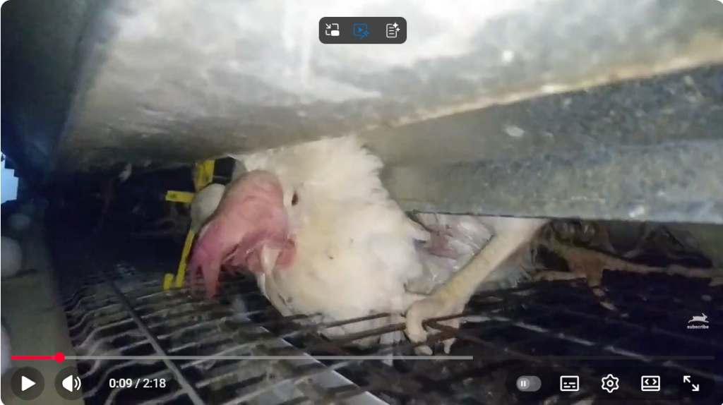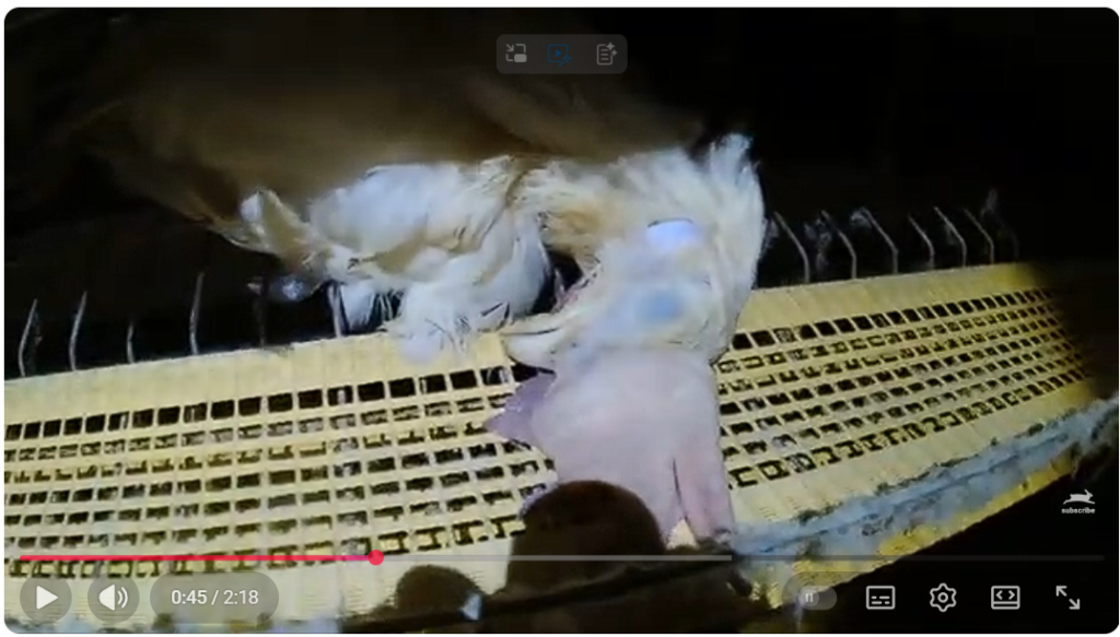 • 映像では、腹部の大きな腫れ、心不全や腫瘍、足の感染症(バンブルフット)、脱肛など、採卵鶏に典型的とされる重い健康問題を抱えた個体が多数映し出されます。