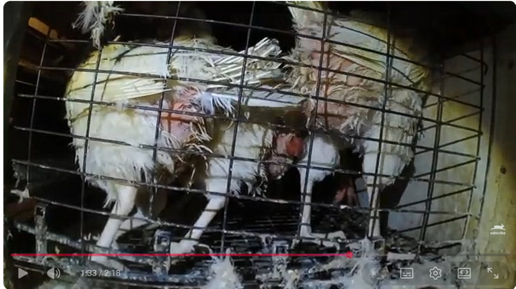 • 1つのケージに最大10羽が入れられ、足を傷つけるワイヤーメッシュ床の上で、暗く不快な環境に終始置かれていたとされます。